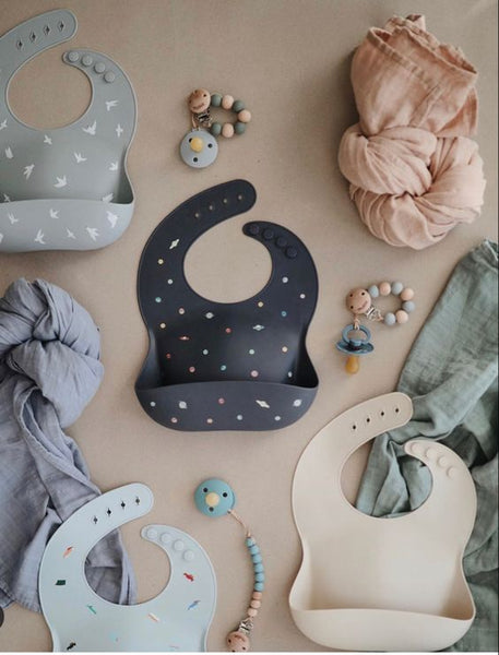 - Keep your little one feeling comfy and clean with our fun-loving collection of silicone bibs. Designed in Sweden, mushie bibs feature classic patterns capturing a look that's both timeless and elegant.