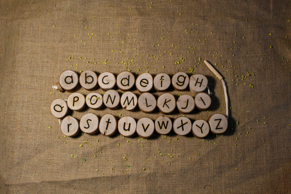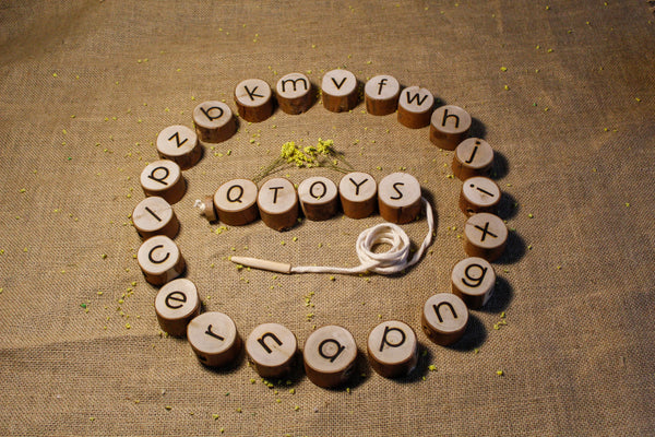 A set of 26 double sided alphabet wooden threading, perfect for hand eye coordination while learning letter recognition.