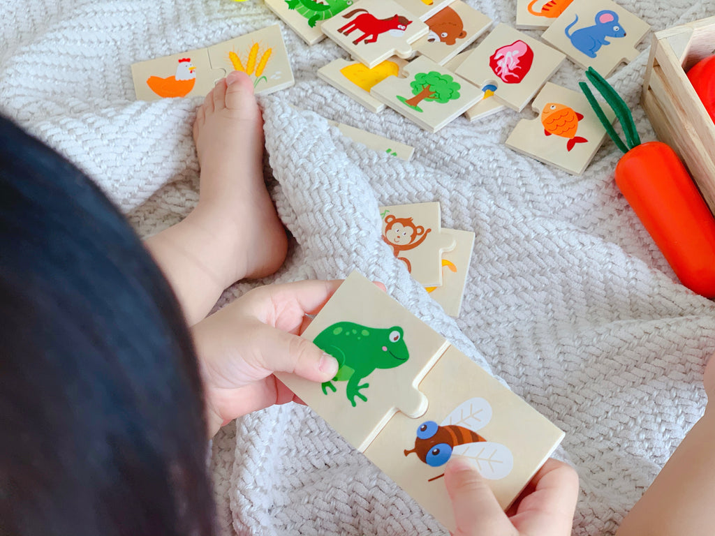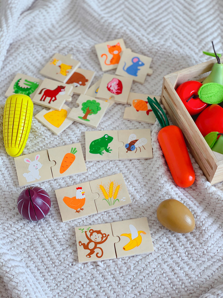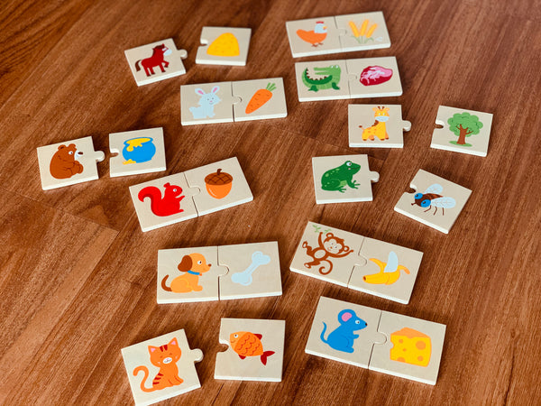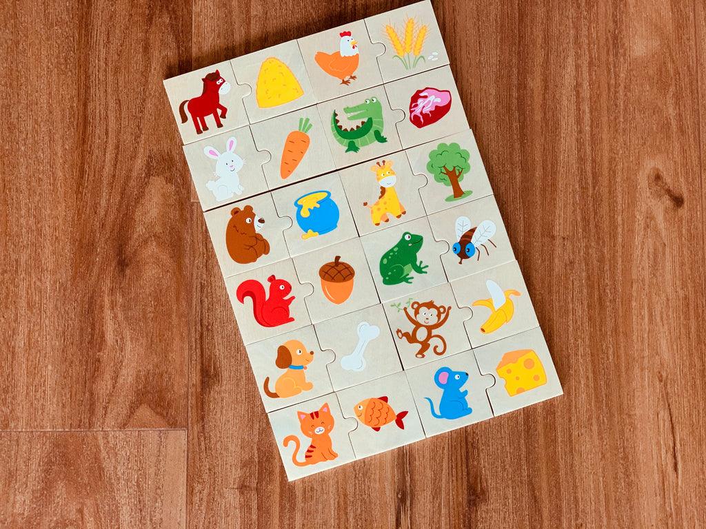 This puzzle set is perfect for your toddler or preschooler to learn about animals, food and categorising. It contains 24 wooden pieces for you to match 12 different kinds of animals to their food!