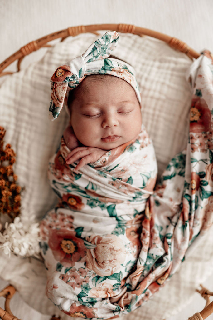 Our Cotton Jersey Wrap is soft and stretchy, it moves and stretches with baby. This wrap comes with a matching topknot.