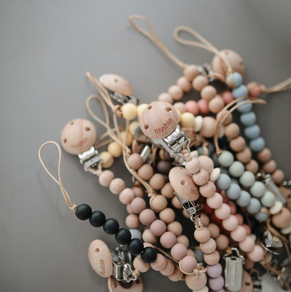 Handmade by moms in the USA, mushie pacifier clips are a favorite for parents and of course babies. Our pacifier clips come in unique and chic, vintage inspired colors that bring to mind a peaceful simplicity.